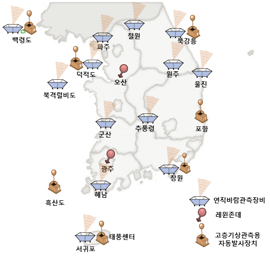 | 레윈존데(7개소)- 자동발사장치 - | 포항, 국가태풍센터, 백령도, 흑산도, 북강릉, 창원, 제2해양기지(덕적도) / 공군 2개소 운영(오산, 광주) |