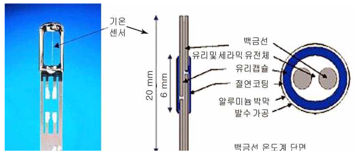 그러나 주간에 태양 복사가 있는 경우에는 태양 복사에 의한 가열량을 보정합니다. 백금저항 기온센서는 그림 2.3과 같이 유리와 세라믹 절연체를 사이에 끼운 2개의 얇은 백금선으로 구성되어 있다. 유리와 세라믹 절연체의 유전율은 온도에 따라 변하고, 이 변화를 백금선 사이의 정전용량 변화로서 검출하여 기온을 측정합니다. 태양복사에 의해 기온이 다르게 측정되는 것을 방지하기 위하여 센서는 고반사 알루미늄 박막으로 코팅되어 있으며, 응답시간을 짧게하기 위하여 미세한 구조로 되어 있습니다.