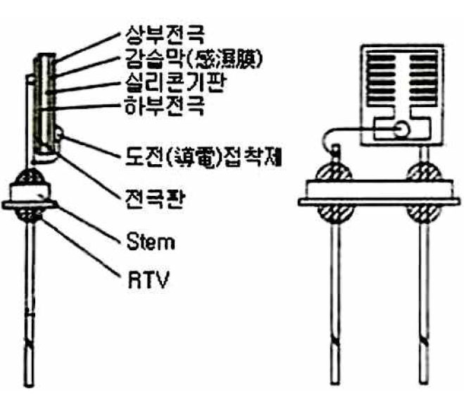 라디오존데의 습도센서로는 정전용량식이 사용되며, 보통 기온센서와 함께 닻가지에 설치되어 있습니다. 이 센서는 유리판 위에 있는 금속층의 하부 전극과 수증기가 통과할 수 있는 박막의 상부 전극 사이에 고분자 감습막이 설치되어 있고, 주위 공기의 습도에 따라 두 장의 전극 사이에 낀 고분자막의 유전율이 변하고 정전용량이 변하는 것으로 습도를 측정합니다. 이 센서는 열용량, 지연, 히스테리시스 등이 작아서 시간 상수가 작고 재현성이 좋은 것이 특징입니다. 태양 복사나 장파 복사에 의한 영향과 물방울 침입을 막기 위하여 알루미늄 캡을 피복하여 사용합니다. 일반적으로 습도센서에는 온도 의존성이 있으며, 저온으로 갈수록 지연이 커집니다.