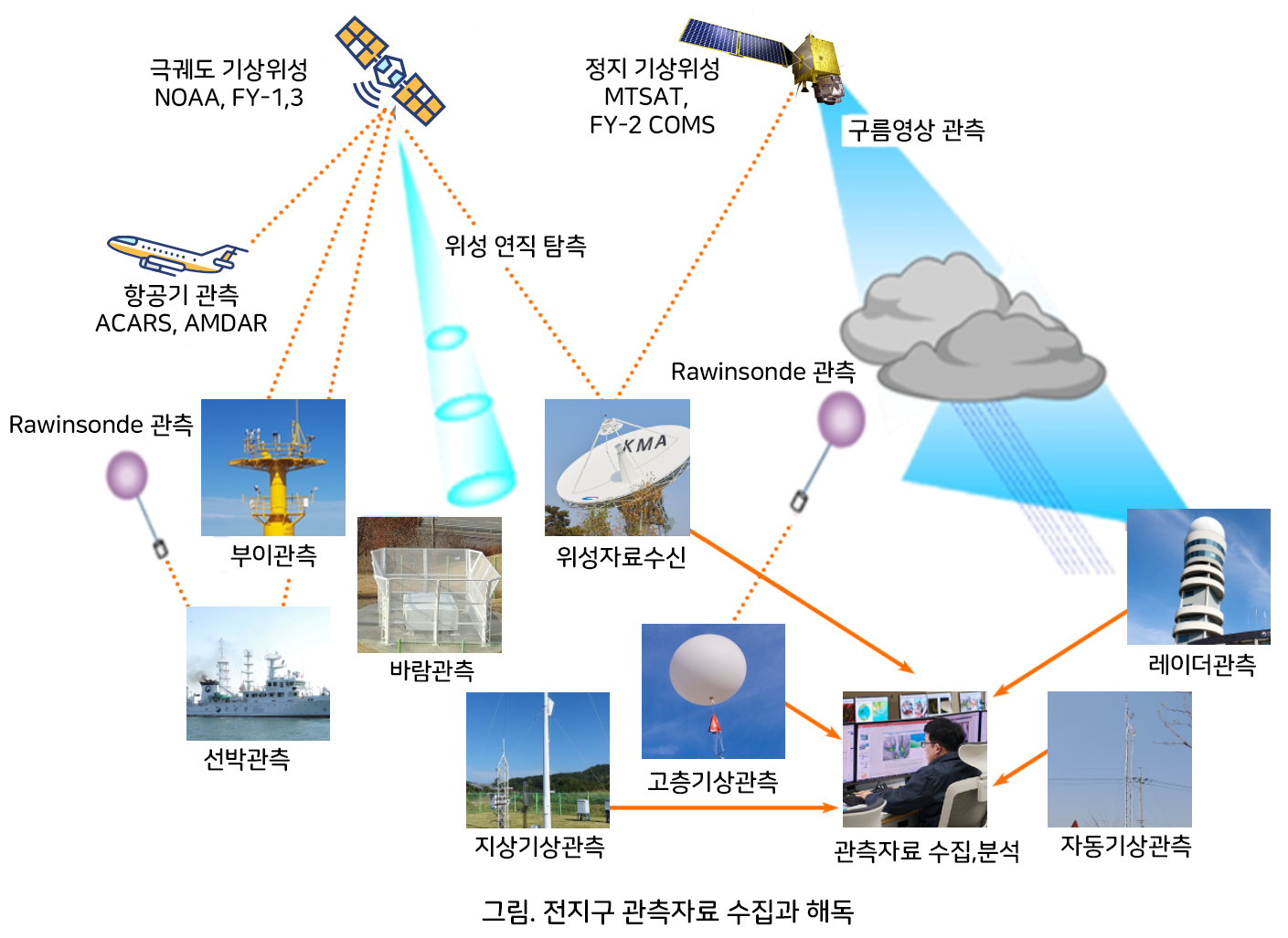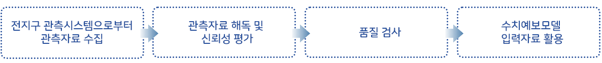 기상관측자료 전처리 수치예보모델에 입력할 관측자료를 준비하는 과정으로 전세계에서 관측한 다양한 종류의 관측자료를 수집하여 해독하고(자료수집 및 해독 과정) 수집된 자료 중 품질이 낮은 관측자료를 제거하는 과정(품질검사 과정)으로 구성되어 있습니다. 관측전처리 과정을 통해 관측자료에 포함된 오차를 평가하고 편차를 제거하는 과정은 자료동화 및 수치예보모델의 성능에 중요한 역할을 합니다.