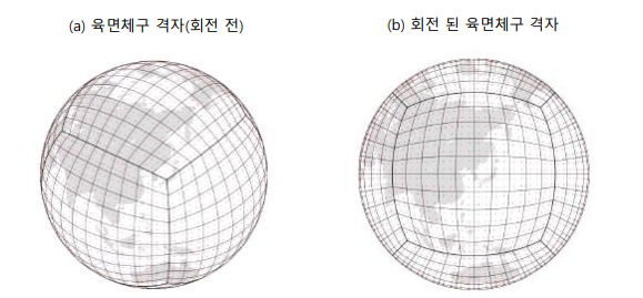(a) ne=10, np=4 인 육면체구 격자, (b) 한반도가 패널의 중심에 위치하도록 회전된 육면체구 격자