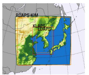 | 초단기모델 | * 12시간 이내 한반도 영역에서 일어난 현상을 아주 상세히 예측하기 위한 모델 * 빠른 개신을 통해 급속히 발달하는 기상현상을 자세히 모의하는데 유리함 * 상위모델로부터 측면경계장을 받아야 함 |