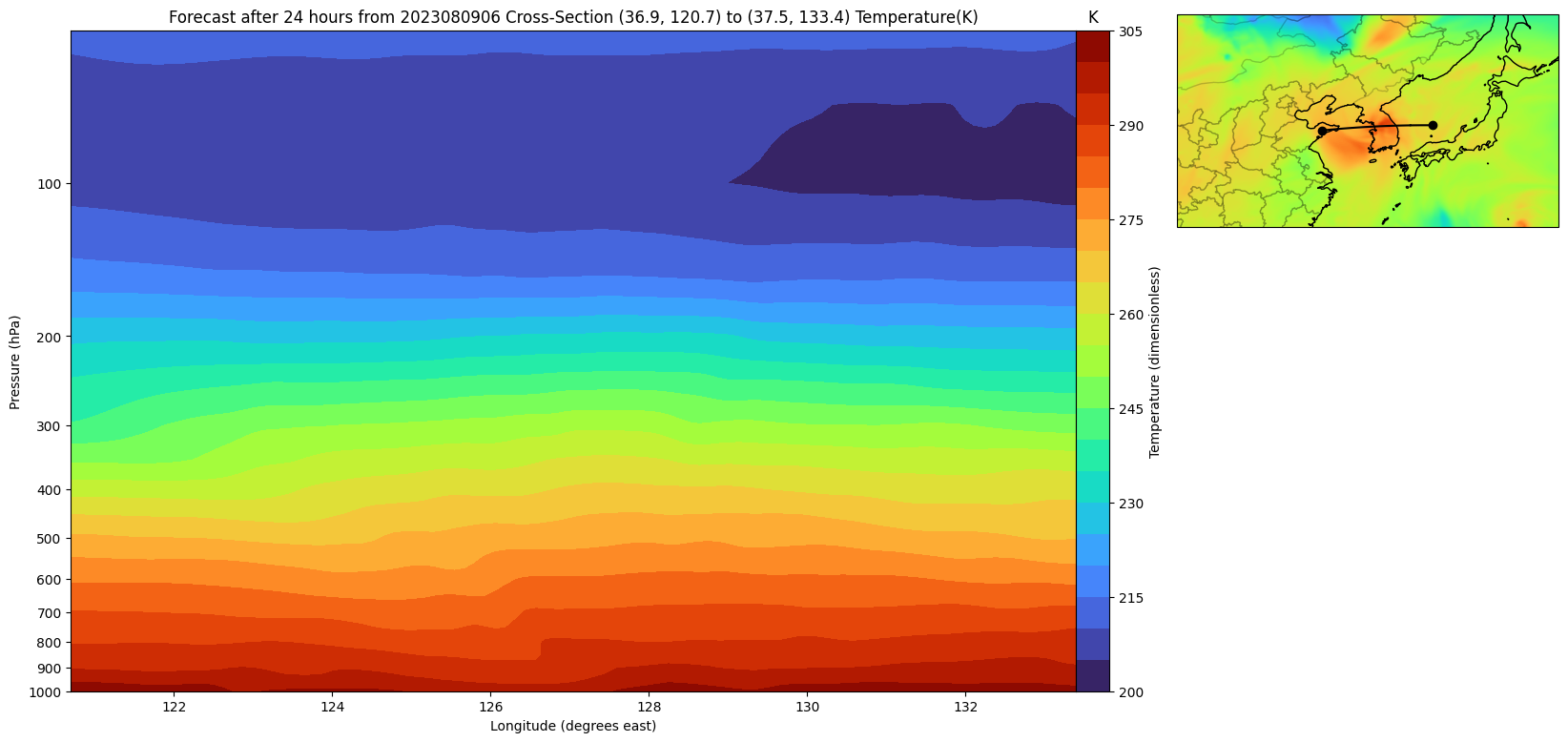 ax.set_title(f'Forecast after {hf} hours from {tmfc_utc} Cross-Section {start} to {end} Temperature(K)')